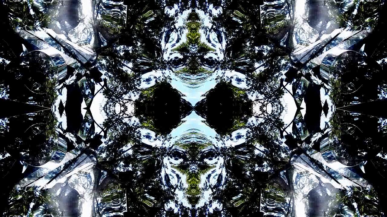 Digital video still of an image from arch<scul loop III using the quad mirror filter at approximately 01:15. The filter takes the image and replicates it into 4 mirrored images each positioned at a different angle that is then seamlessly meshed together to form one image. The Sculpture was placed in a backyard on top of the grass and the reflection of oak trees can be seen above. The visual is mesmerizing and full of images unknown.